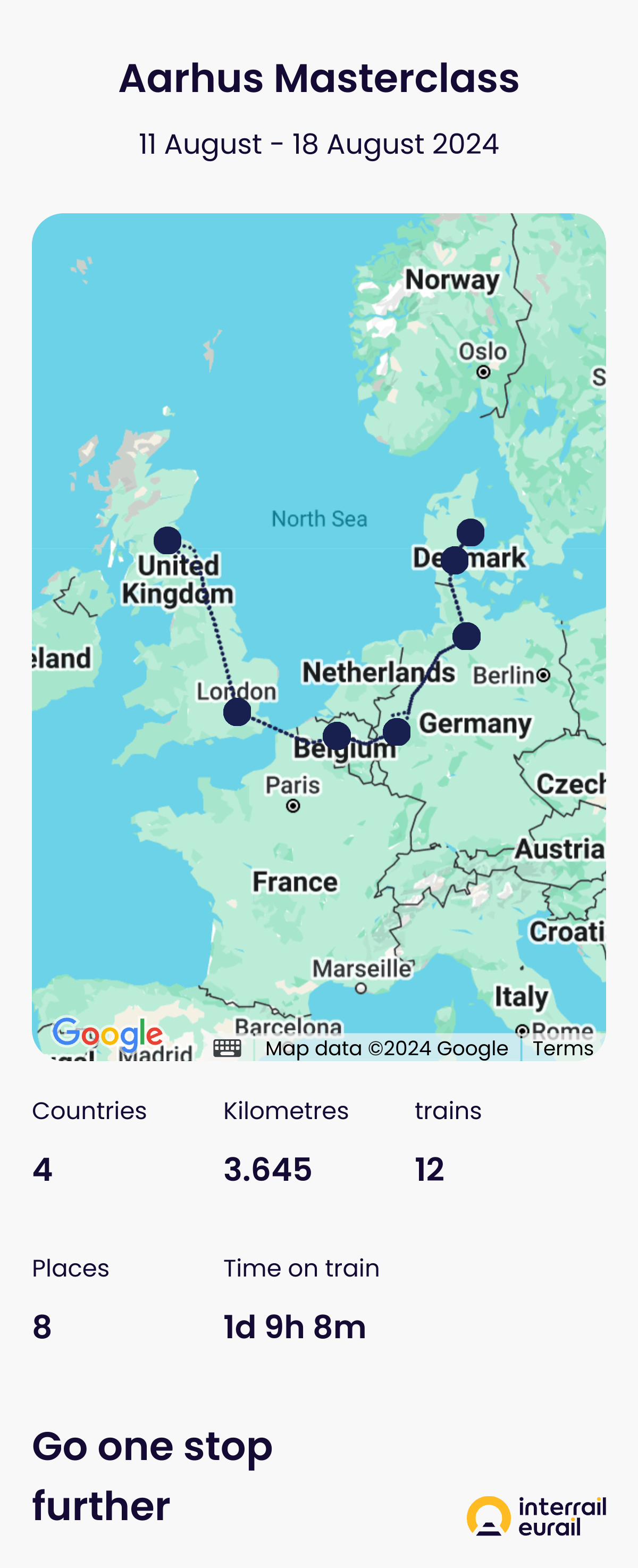 I travelled from Edinburgh to Aarhus by train. This was (so far) my longest solo train trip, a round trip total of 3645km.
