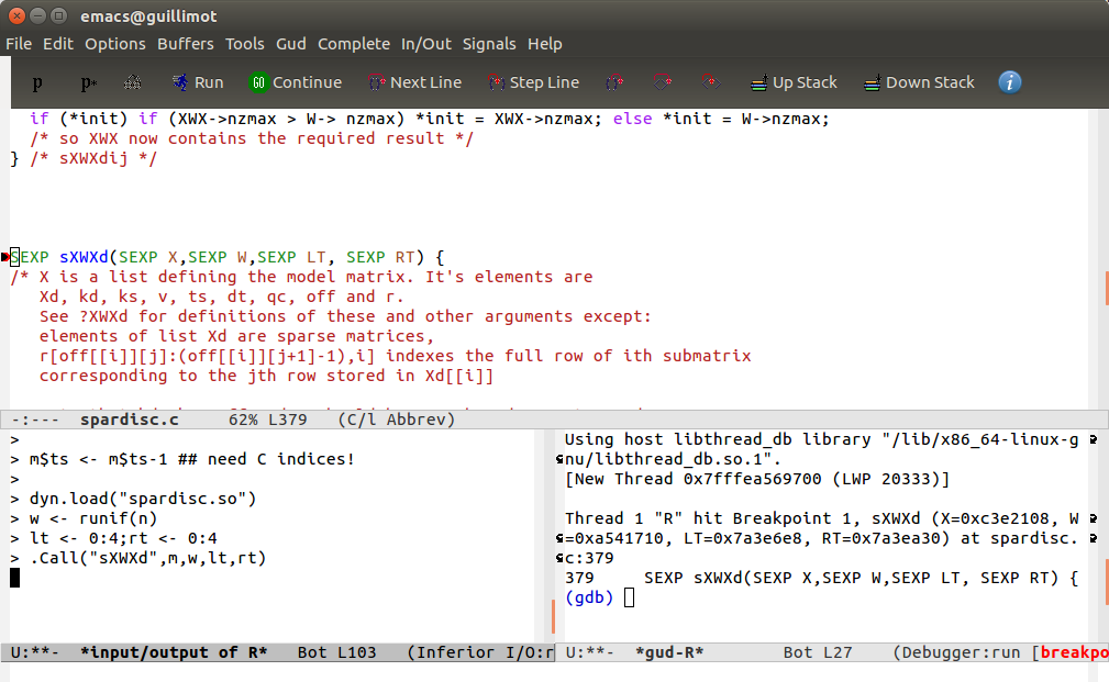 The advantage to this approach is the graphical setting of breakpoints combined with the ability to move around your code as you debug it in a convenient way. Once you know how to do this it is very quick to set up, but the first time through it is easy to go wrong, so I have provided very detailed instructons below. The instructions assume that you are producing a shared library and loading it explicitly using 'dyn.load' in R. If you are debugging a package things are basically the same, but you need to install the package from its source tree (i.e. not from a .tar.gz), start emacs from within the 'src' directory and set the symbolic link to R from there too.